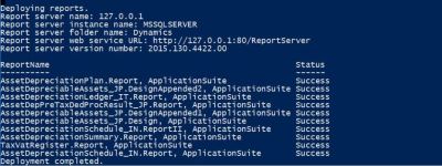 Now I want to deploy reports starting with AssetDep and TaxVatRegister , so I ran following command and in the output you can see only those reports get deployed. This trick is helpful in managed environment like UAT not prod when you have some issues with reports in those enviornments.