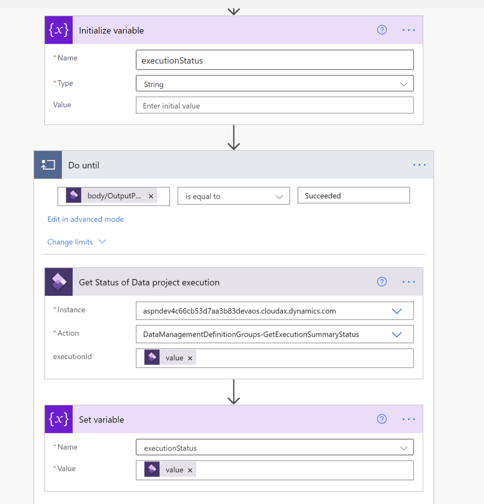 The following three steps are used for checking the status of the data project execution triggered in the above step. Data package is not going to be present in the blob storage unless execution is succeeded. So call to get execution status AP is done in the loop till the time API returns succeeded as output.