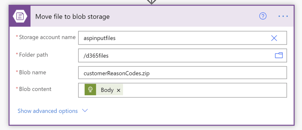 In the next step, I am moving downloaded package to the blob location. Search for Azure blob storage trigger and select create blob V2 action , give the name for file and body received in the step above to write content in the file.