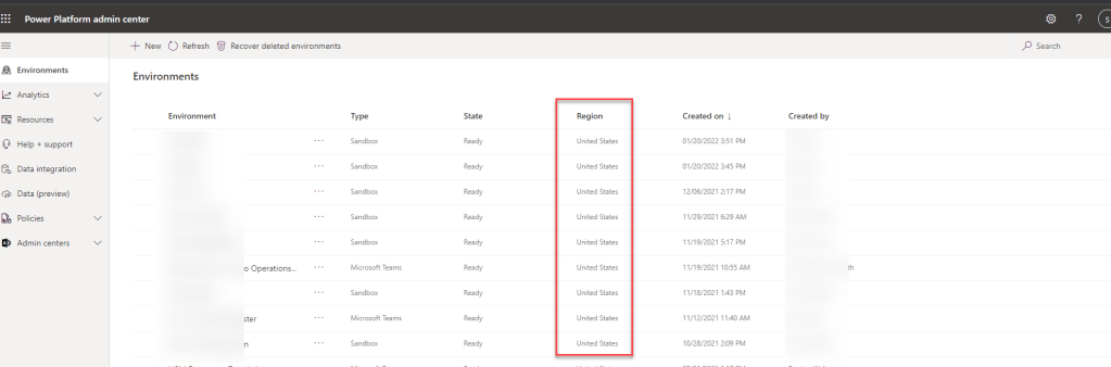 However, this screen only shows environment name as United states. It does not show whether it belongs to East or West. You can figure that out by using PowerShell command.
