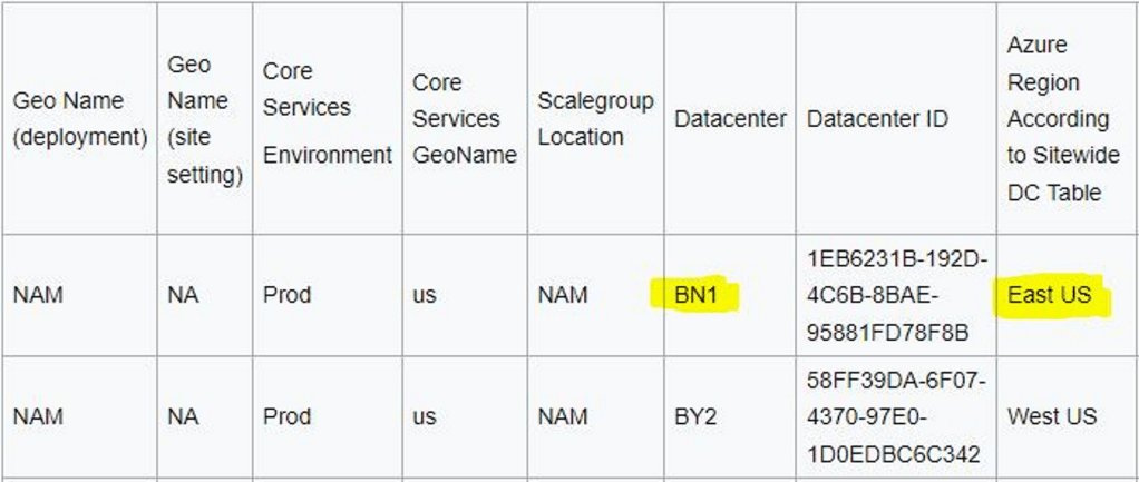 You can then check the datacenter as written against name in the above pic(bn2 or by2) and compare it with the below screenshot. If value is bn1 your environment in east US data center.