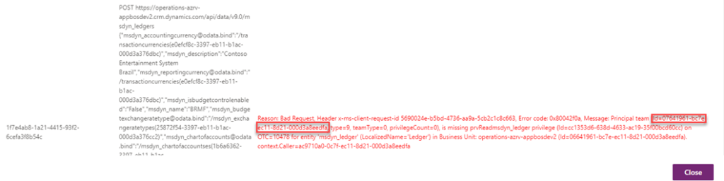 You can resolve this error by giving System administrator access to team Id or root business unit. In the below screenshot after principal team ID, there is a GUID (07641961-bc7e-ec11-8d21-000d3a8eedfa). You can use this to find out the team and assign the system administrator role.