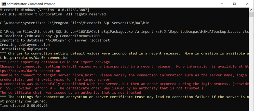 SqlPackage.exe /a:import /sf:J:\Exportedbacpac\HSMUATbackup.bacpac /tsn:localhost /tdn:AxDBCopy /p:CommandTimeout=1200 /TargetTrustServerCertificate:True