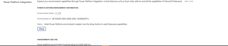 Visit the power platform integration section for the F&O environment which you want to connect to dataverse environment and click on set up button shown in below screen.