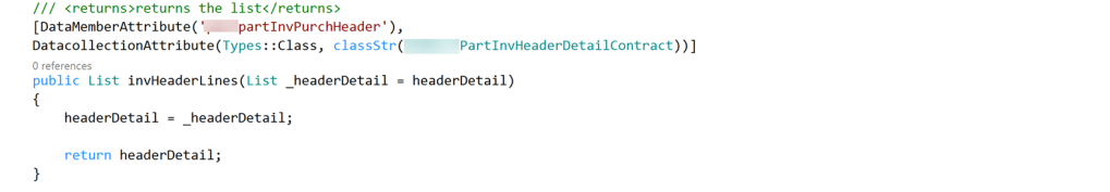 In some scenarios we use nested contract classes. For example, one contract accepting another contract class. Here is example, In the service operation I shown above which excepts “InvHeaderContract” has data member attribute which is another contact class “partInvHeaderDetailContract”.