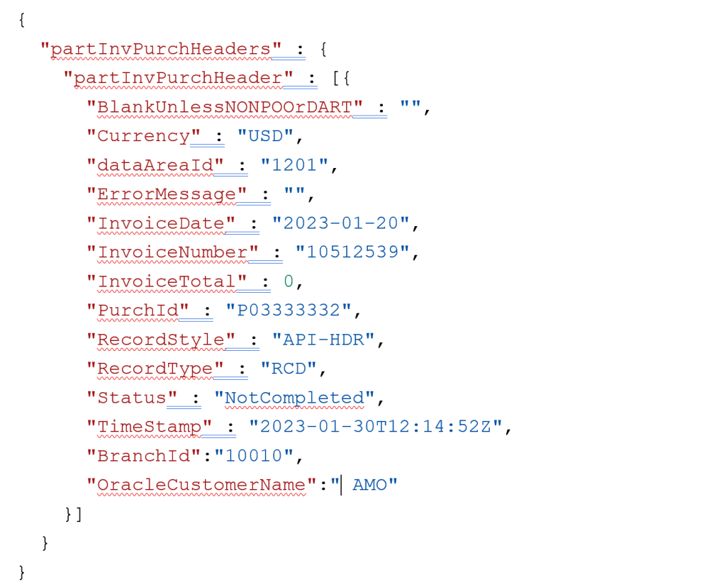 In such a scenario’s, JSON should have two key elements “partInvPurchHeaders” which is nothing but parameter for service operations and another one is “partInvPurchHeader” which is another data contract which is data member attribute of first contract class. Look at the example below to understand how the JSON is formed. Rest of the element of the JOSN like Currency , Invoice Number etc are data member attributes of contract class partInvPurchHeader.
