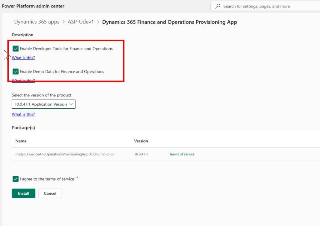 Dynamics 365 Finance and Operations Provisioning app install Finance and Operations in your environment. Make sure you are selecting the highlighted things below when you install this app. The most important setting is to Enable Developer Tools for Finance and Operations and Enable Demo Data for Finance and Operations checkboxes as these options enable developer experience and gives you demo data in your environment.