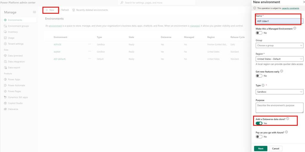 First step is to log in to power platform admin center, go to manage option and click on environments and click on new and fill in the values shown in below image.
