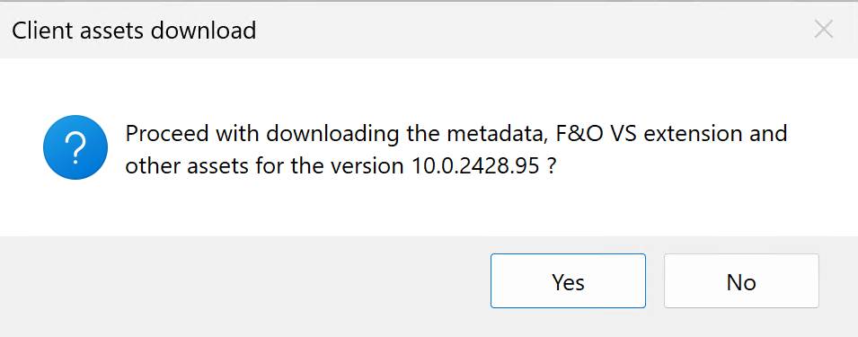 VS is going to ask you to download Metadata, F&O extensions and other assets, click on yes. Automatically a zip file containing metadata, a copy of cross ref DB is going to be downloaded.