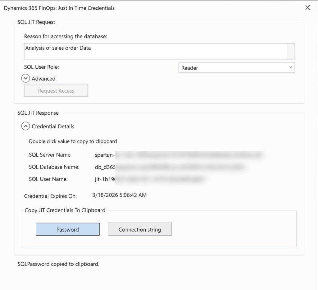 If you want to connect to SQL DB associated with UDE environment, then you can click on Tools > SQL credentials for Dynamics 365 Fin Ops option. Once you click it, you are going to get following option where you are going to enter reason for connection and click Request access. VS is going to fetch you server details along with password and connection string.