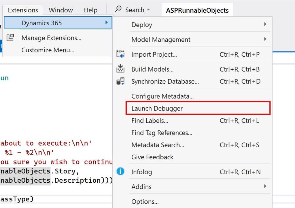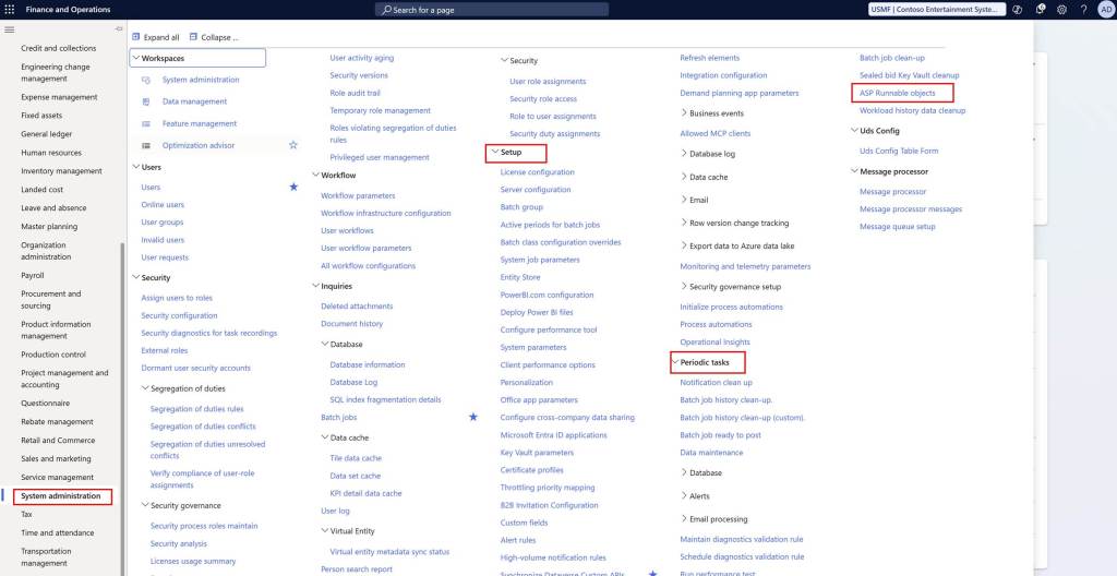I have created a form with name “ASP Runnable objects”. This form is used to run runnable classes from F&O UI. I created a menuitem for it, and placed it in System Administration > Set up > Periodic tasks. After that I did full build of my model to make sure no compilation error exists.