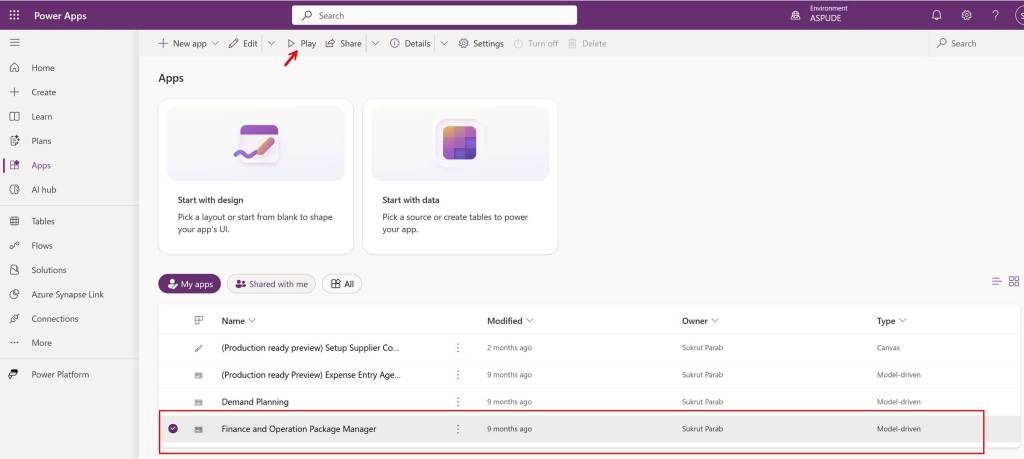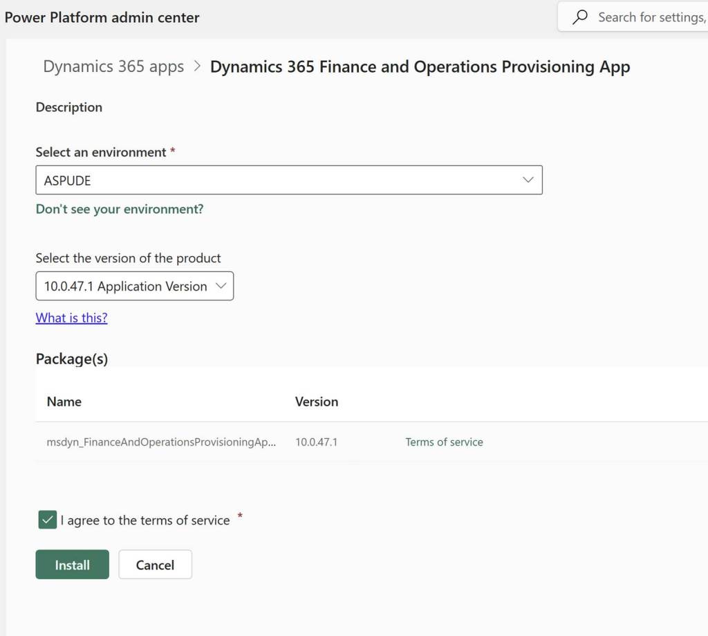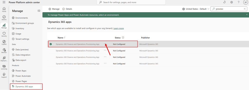 Applying updates is common task we perform whenever Microsoft releases new updates. Updating in a UDE environment is easy and can be done through the Power Platform Admin Center. Visit power platform admin center and click on Manage option and then on Dynamics 365 apps. Search for Dynamics 365 Finance and operation provisioning apps and click on three dots and then click on Manage option.