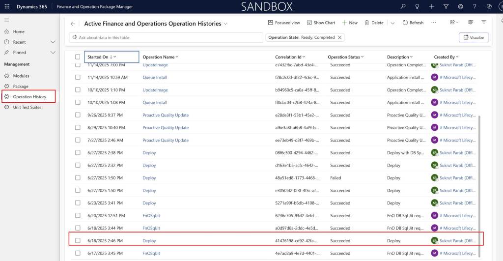 Once you open the app, you can click on Operation History to see all the activities / operations perform in the environment. As you see below , the deployment I performed is succeeded.